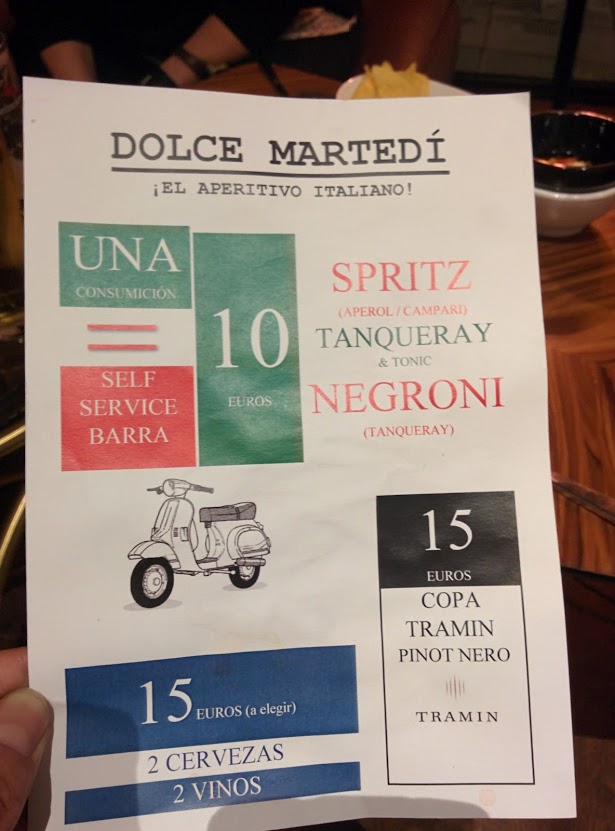 Lo normal es que lo encontremos un jueves o viernes, habiendo sitios que también lo incluyen el miércoles. Pero en nuestro caso era martes y parecía más difícil. Pero en Madrid si quieres lo haces, siempre encuentras la oferta adecuada para ti y para ese momento, y eso me encontré, el «Dolce Martedi».