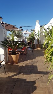 La terraza cuidad y bonita, con una parte de mesas altas, bajas e incluso sillones de relax. Una preciosa puesta de sol para que cualquier visitante, no sólo los usuarios del Hotel la disfruten.