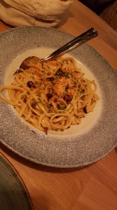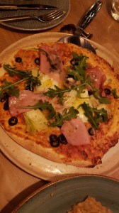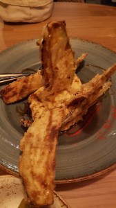 Unas berenjenas en tempura con humus, unos tallarines con camiones al ajillo y una pizza vegetal, una magnífica magnífica, bien atendida y con buenas calidades-cantidades que no llegó a 20 euros persona.