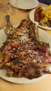 Tras el paseo, una estupenda comida en un restaurante recomendad: Cava Alta, no es un restaurante de 20 euros, más bien por el doble, pero merecedor de visita ya que las calidades de los productos eran excepcionales. Una ensalada de temporada junto a un milhojas de calabacín y sobrasada delicioso, nos abrió el apetito para dar paso a este chuletón de kilo y medio y estas ricas filloas.