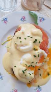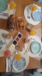 Nuestra selección, además de los elementos que vienen por defecto: zumo de naranja o pomelo rosa, bizcocho de queso, yogur con semillas, mermeladas, mantequilla, panes de maíz y centeno, mini-bolleria, scones, café, té o chocolate; nos hemos decantado por tostas, tartar de atún, y como no, los clásicos benedictinos.